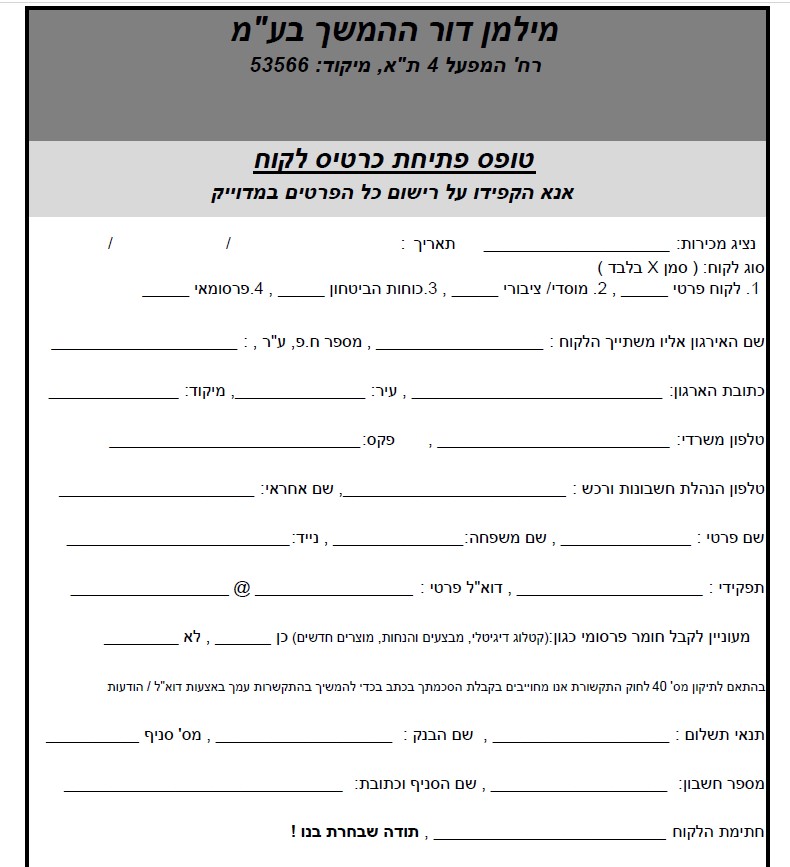 הורד JPGטופס לפתיחת כרטיס לקוח חדש במערכת