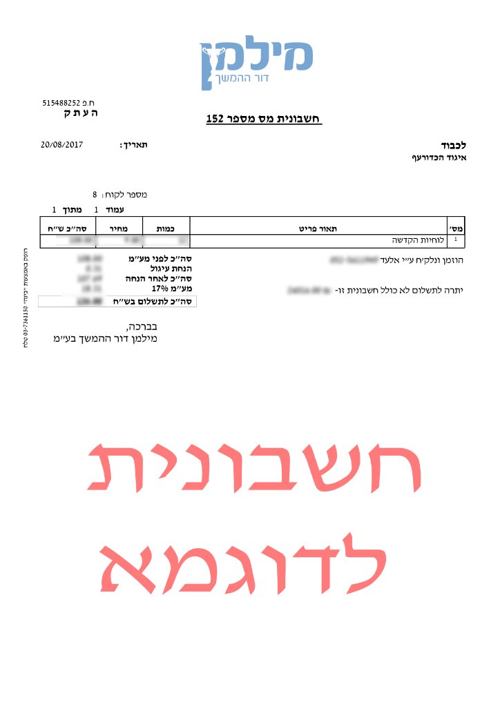 הורד JPGדוגמא לחשבונית מס של מילמן דור ההמשך בע"מ