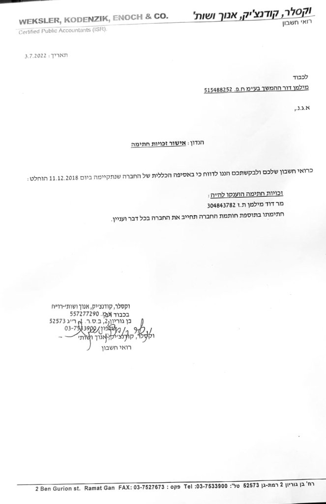 מסמכים רשמיים של חברת מילמן דור ההמשך בע"מ להורדה