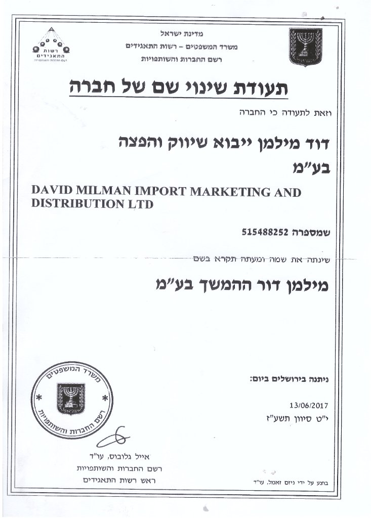תעודת התאגדות מרשם החברות - דוד מילמן ייבוא שיווק והפצה בע"מ