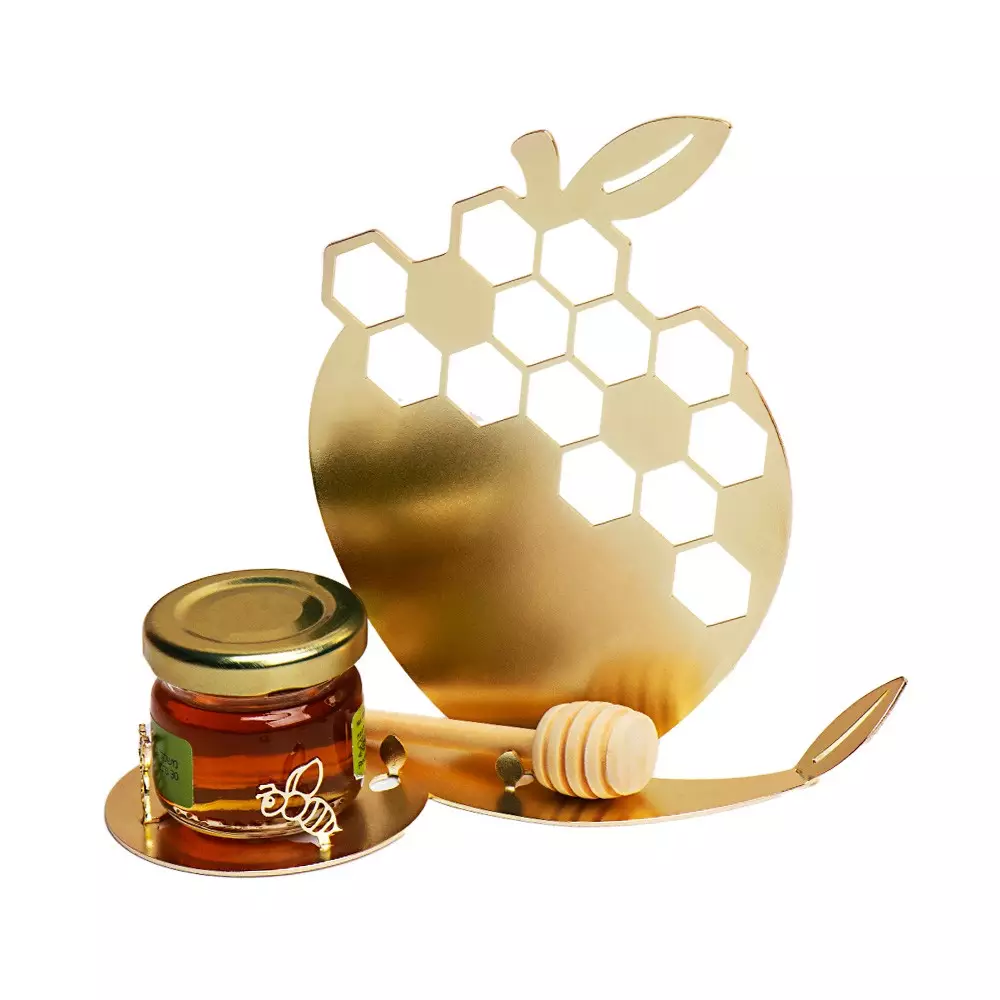 מעמד דקורטיבי ראש השנה "תפוח" חלול לייזר צבע זהב עם צנצנת דבש, מקל ופרלינים