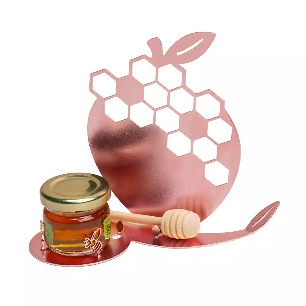 מעמד דקורטיבי לראש השנה בצורת תפוח כם חללים בתפוח ושמגיע עם צנצנת דבש, מקל לדבש ו-3 פרלינים. המעמד עשוי ממתכת חתוכת לייזר והוא מצופה בצבע ורוד "רוז גולד" ואפשר להוסיף לוגו או הקדשה אישית. גודלו של המעמד 12.5 ס"מ*14.5 ס"מ ומשקלו 200 גרם.