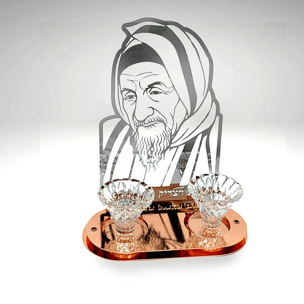 מעמד נרות שבת – דמות רבי ישראל אביחצירא ✔ עשוי מתכת אלחלד בחיתוך לייזר מדויק ✔ גימור יוקרתי בגוון רוז גולד ✔ בתי נרות מזכוכית קריסטל עבה ואיכותית ✔ יודאיקה תוצרת מפעלנו