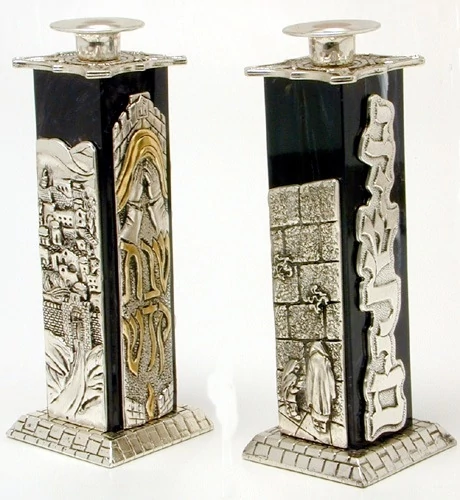 פמוטים לנרות צבע שחור ירושלים הכותל "שבת קדש" מצופים כסף 925