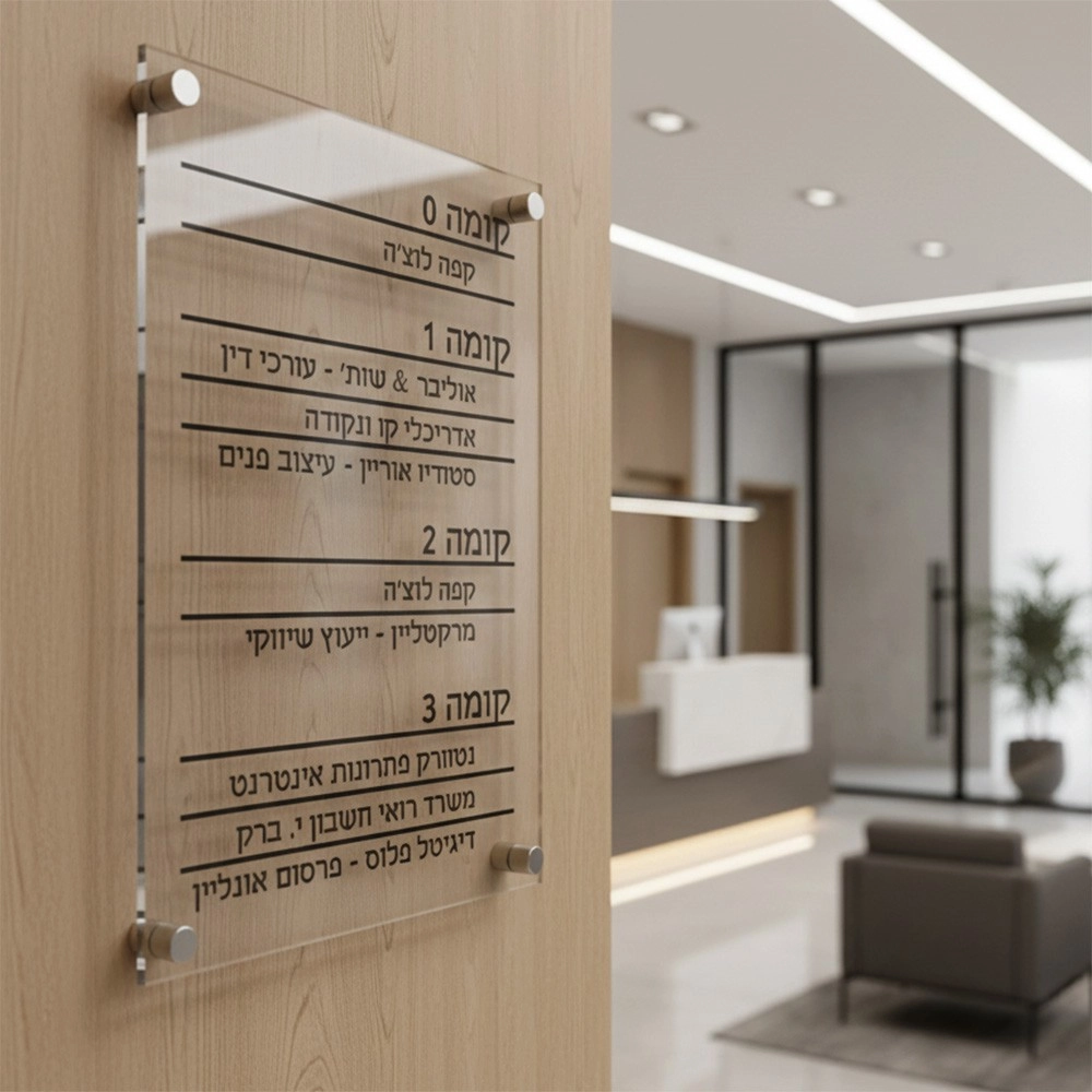 שלט פלסטיק שקוף יוקרתי ומודרני למבנים אדריכליים ומשרדים בהתאמה אישית ✔ עיצוב בהתאמה אישית ✔ הדפסה ישירה בטכנולוגית UV ✔ עמידות גבוהה ✔ במגוון גדלים וצבעים