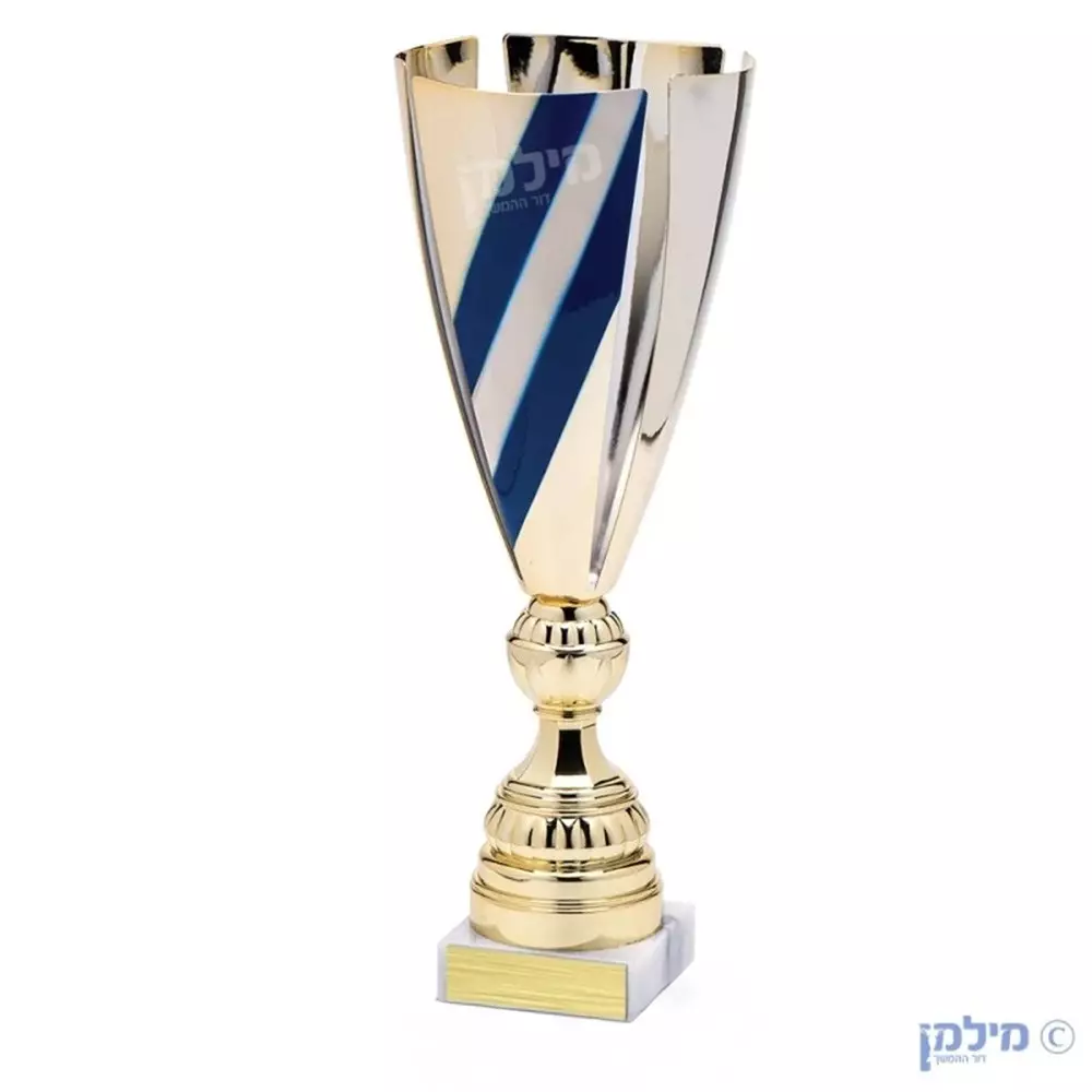 גביע יוקרתי על בסיס שיש איטלקי מעוצב בצבעי דגל ישראל ✅ בסיס שיש איטלקי ✅ המחיר כולל לוחית הקדשה ✅ כוס מהודרת תוצרת איטליה ✅ גביע ייחודי למפעלנו ✅ מגיע בשלושה גדלים