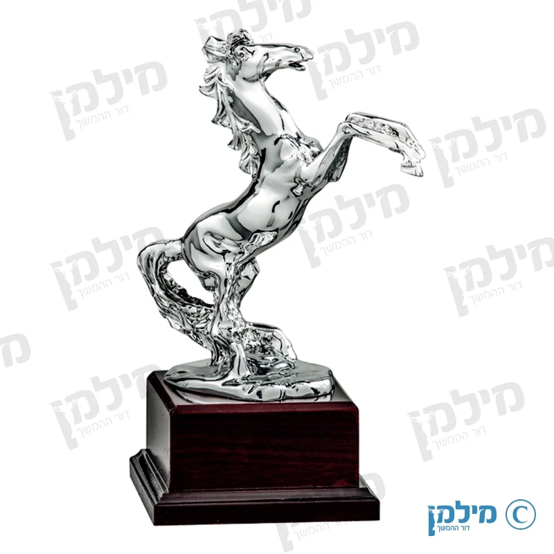 פסלון מהודר של סוס קופץ, הפסלון עשוי מחומר "רזין" זהו חומר העשוי מסגסוגת של פוליאסטר ומצופה בציפוי כסף 925 אוקסיד. הפסלון מונח על בסיס עץ מהודר.
