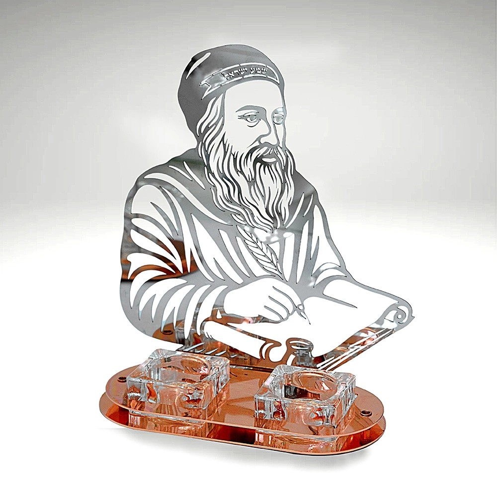 מעמד נרות שבת – דמות רבי שמעון בר יוחאי ✔ עשוי מתכת אלחלד בחיתוך לייזר מדויק ✔ גימור יוקרתי בגוון רוז גולד ✔ בתי נרות מזכוכית קריסטל עבה ואיכותית ✔ יודאיקה תוצרת מפעלנו