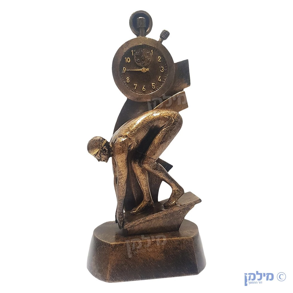 גביע פסלון שחייה של שחיין בעמדת זינוק במקצה תחרות שחייה ושעון סטופר מעל. הגביע פסלון בגובה 28 ס"מ והוא עשוי מרזין - סגסוגת פוליאסטר. כמו כן, ניתן לצרף הקדשה אישית, והוא מגיע בתוך אריזה אישית מקרטון. אנו - במילמן דור ההמשך - קיימים מעל 50 שנה ומייצרים את כל המוצרים שלנו בעצמנו ובזמן המהיר ביותר וזאת תוך שמירה על הסטנדרטים הגבוהים והבלתי מתפשרים ביותר. בנוסף, אנחנו היצרנים האיכותיים ביותר של גביעים ופסלונים - מרזין, מזכוכית וחומרים אחרים - בנוסף למוצרי הוקרה נוספים כגון מדליות, מגיני הוקרה, וכו' ומעסיקים את המקצוענים המובילים בתחומם מהארץ והעולם.