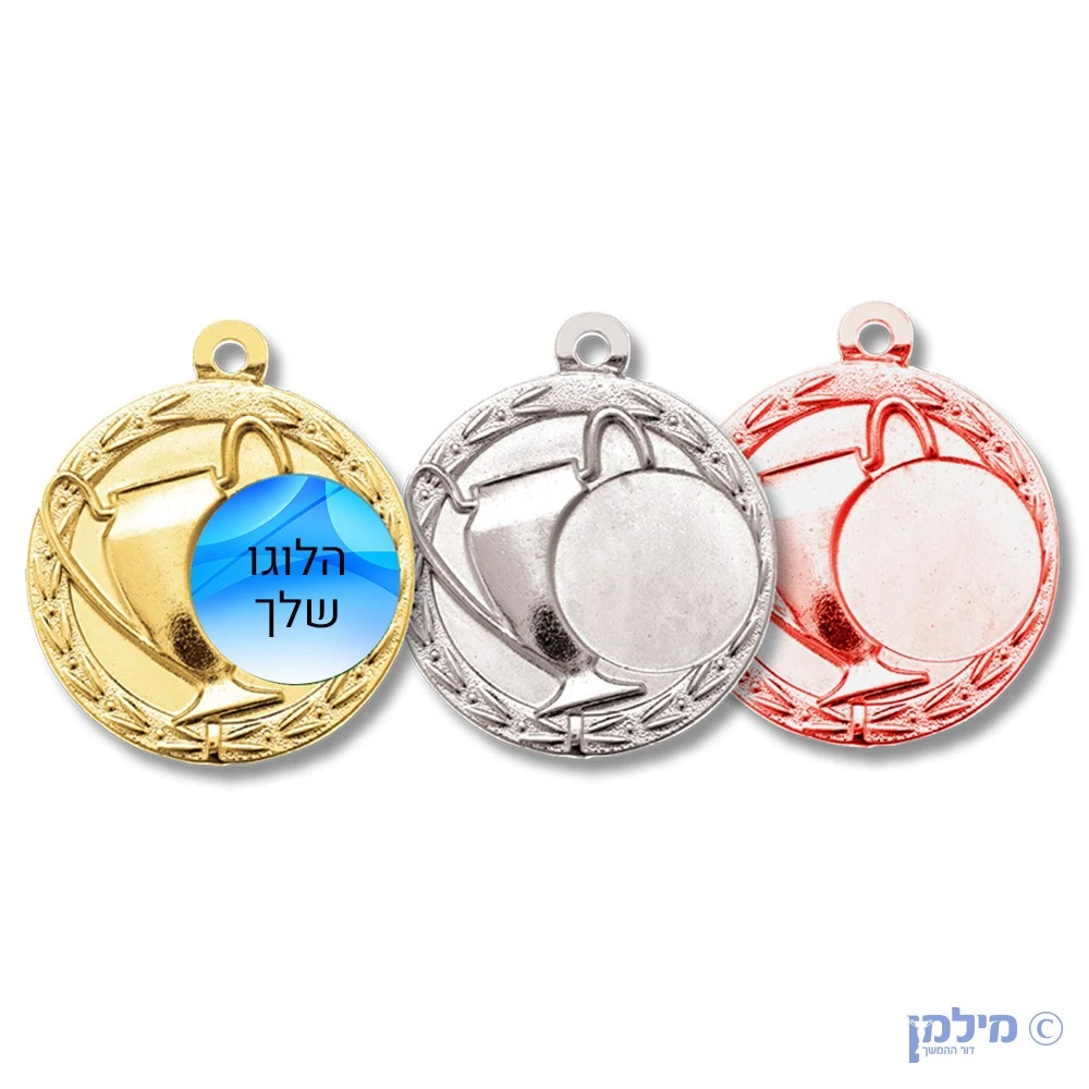 מדליה מוטבעת בעיצוב גביע, עם הדפסה דיגיטלית בקוטר 5 ס"מ ✔ הבלטת תלת מימד ✔ מגיע בשלושה צבעים: זהב, כסף וארד ✔ מדליה מתכתית איכותית, תוצרת ישראלית כחול לבן! ✔ מגיע עם סרט בעובי 2.2 ס"מ (מעל הסטנדרט המקובל בשוק) וקליפס מתכתי ✔ ניתן להוסיף לוגו/טקסט בגב המדליה ניתן להזמין בכמות של 100 יח' ומעלה