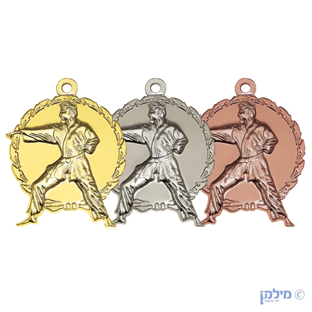 מדליית קארטה מוטבעת תלת מימד בצורת לוחם קארטה בתנועת אגרוף, עשויה ביציקת מתכת זמק. המדליה בקוטר 5 ס"מ והעובי הוא 3 מ"מ ומיוצרת במפעלנו תוצרת כחול לבן תוך שמירה על בקרת איכות גבוהה במיוחד. המדליה יכולה להיות זהב, כסף או ארד וניתן לצרף למדליה סרט בתשלום מינימלי. הסרט יכול להיות במבחר צבעים: סרט כחול לבן כחול, אדום לבן אדום, שחור או ממותג לצרכים שלך. הסרטים הם בעובי 2.2 ס"מ מעל הסטנדרט המקובל ומחוברים עם קליפס מתכתי אל חלד חזק. בנוסף ניתן להוסיף הקדשה אישית ולוגו בגב המדליה ואפילו קיימת האופציה לכיתוב שם משתנה, וכפי שניתן לראות המחירים משתנים בהתאם לכמות המבוקשת. מילמן דור ההמשך מייצרת בעצמה את המדליות מעל 50 שנים וחשוב לנו לשמור על סטנדרט הגבוה ביותר עבור הלקוחות