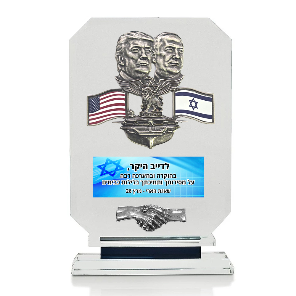 מגן הוקרה מזכוכית עם תבליט של טרמאפ וביבי