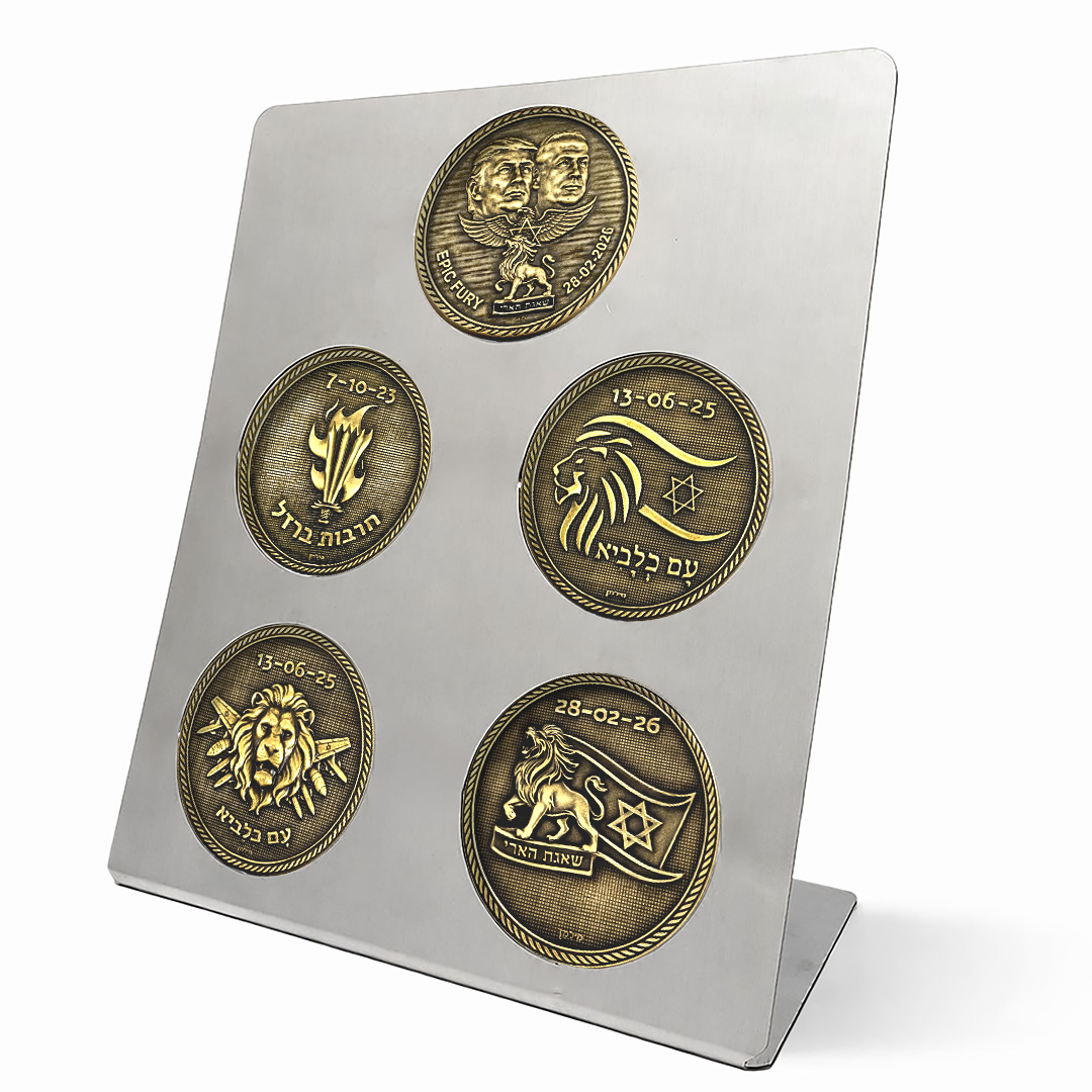 סט 5 מדליות שמנציחים את מבצעי "שאגת הארי", "עם כלביא" ו"חרבות ברזל" מיציקה ידנית ועל גבי מעמד יפה ממתכת עבור השולחן או המדף שלך. הסט כולל מדליית "שאגת הארי" עם עיצוב של נתניהו וטראמפ עם כנפי צניחה וכיתוב באנגלית EPIC FURY, שני מדליות "עם כלביא" עם האריה הירושלמי ודגל, אחד "עם כלביא" עם אריה ומטוס חיל האוויר, ואחד "חרבות ברזל" עם להבה.